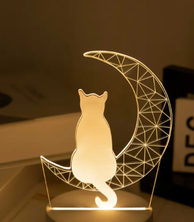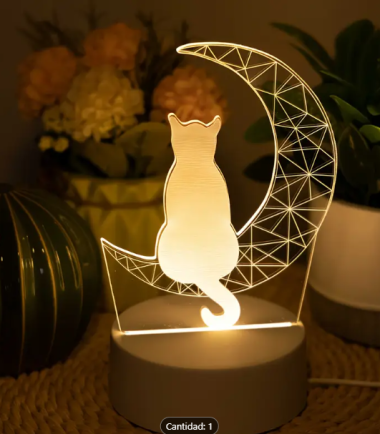 Ilumina tus noches con un toque mágico y felino gracias a esta lámpara LED con diseño de gato sobre una media luna geométrica. Su luz cálida y envolvente crea un ambiente acogedor y