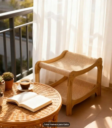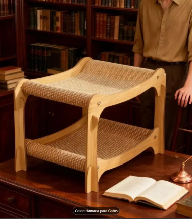 Esta elegante hamaca doble para gatos es el lugar perfecto para que tu felino descanse, juegue y se relaje. Fabricada con una estructura de madera natural resistente y un tejido transpirable, combina funcionalidad