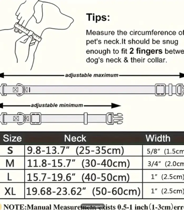 Medidas de circunferencia de cuello: 40-50 cm (asegurarse que le queden 2 dedos entre el collar y cuello)