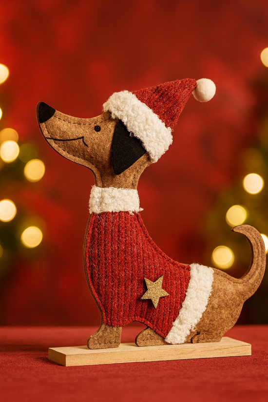 Perfecto para colocar en repisas, escritorios o al pie del árbol de Navidad, este adorno combina el amor por las mascotas con el espíritu festivo. Ideal para los amantes de los perros y la decoración temática.