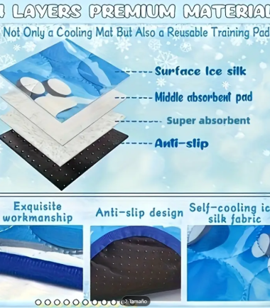 - Enfriamiento automático: se activa con el contacto del cuerpo de la mascota, sin necesidad de refrigeración previa.
