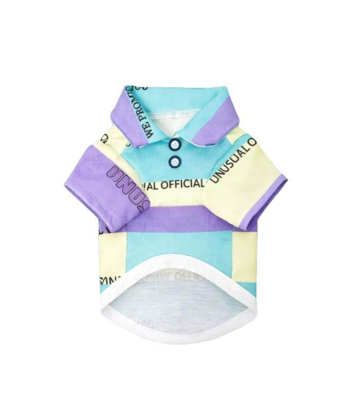 Dale a tu mascota un look fresco y a la moda con esta camisa para perro tipo polo, diseñada para combinar estilo, comodidad y funcionalidad. En primer lugar, su diseño moderno con bloques de color y detalles gráficos aporta un toque urbano y actual, ideal para destacar en cualquier ocasión.