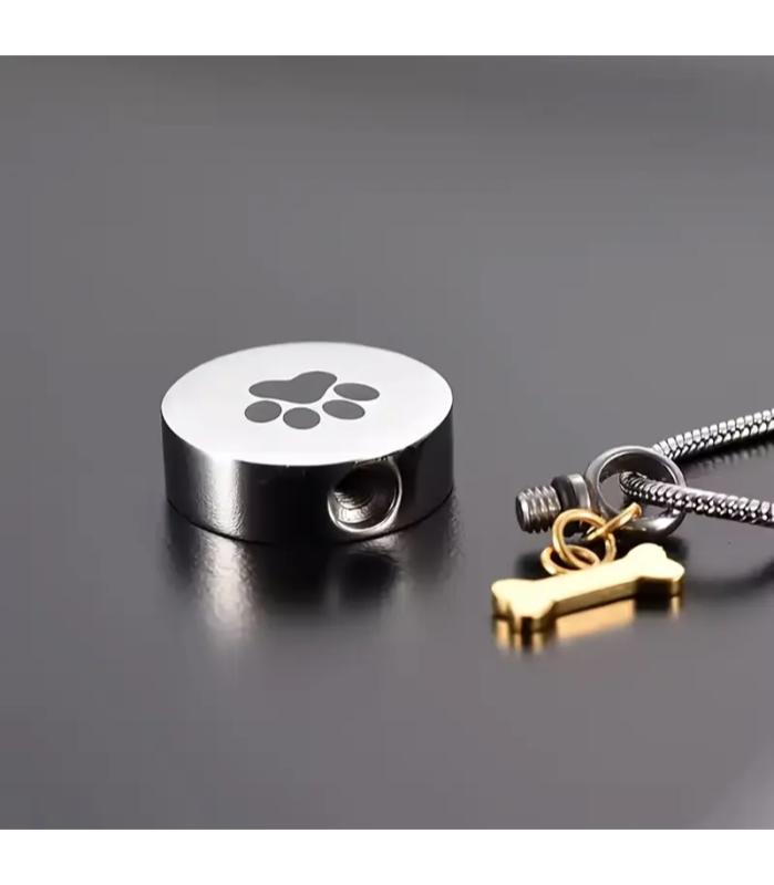 El colgante circular de acero inoxidable incluye una delicada huella negra en el centro. Es un símbolo del amor y la conexión eterna con tu mascota. Además, incorpora un pequeño charm dorado en forma de huesito. Este añade un toque tierno y significativo que realza aún más su belleza.
