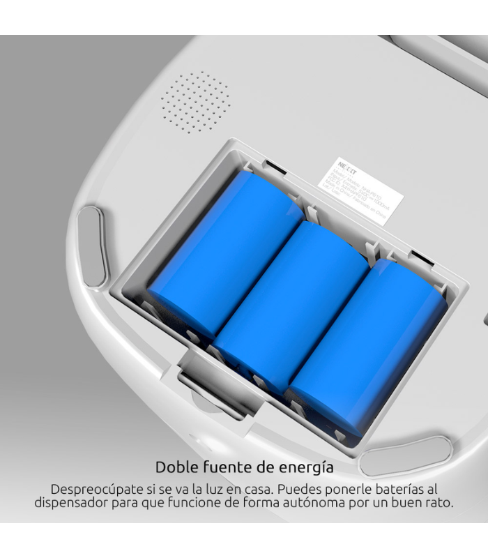 • Despreocúpate si se va la luz en casa. Puedes ponerle baterías al dispensador para que funcione de forma autónoma por un buen rato.