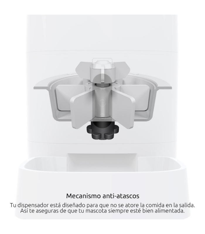 • Tu dispensador está diseñado para que no se atore la comida en la salida. Así te aseguras de que tu mascota siempre esté bien alimentada.