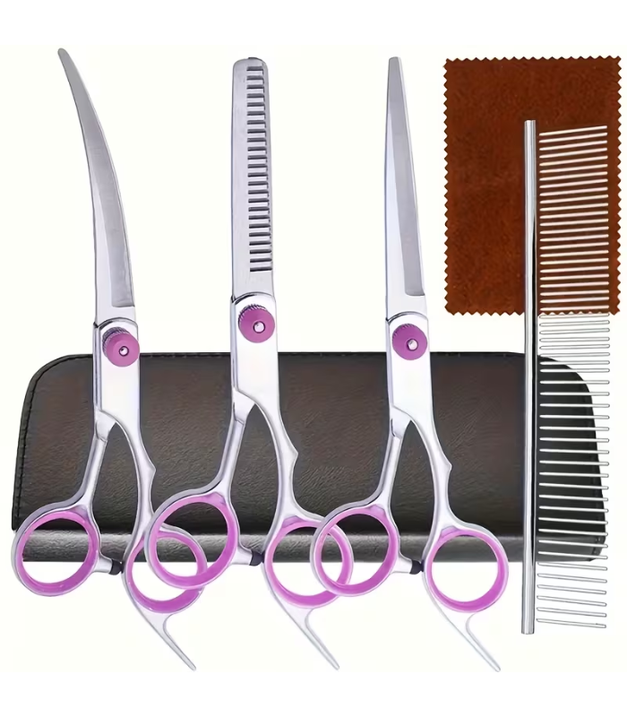 Este completo set incorpora tijeras rectas, tijeras curvas, tijeras de entresacar, peine metálico profesional, paño de limpieza y estuche protector, ofreciendo todo lo necesario para sesiones de grooming cómodas y eficientes. Gracias a su fabricación en acero inoxidable resistente, garantiza durabilidad, precisión y un excelente desempeño en cada uso.