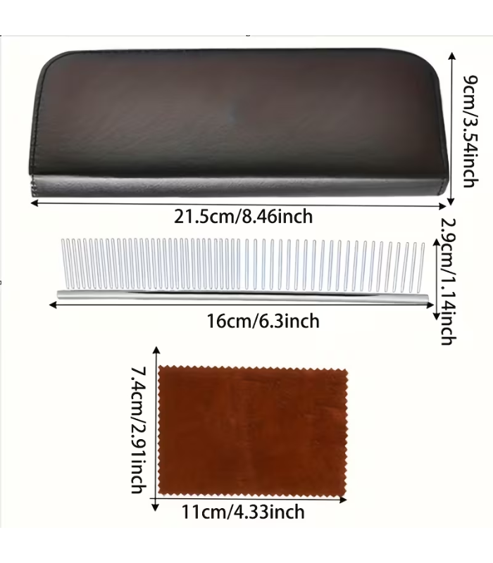 - Además, incorpora peine metálico y paño de limpieza.