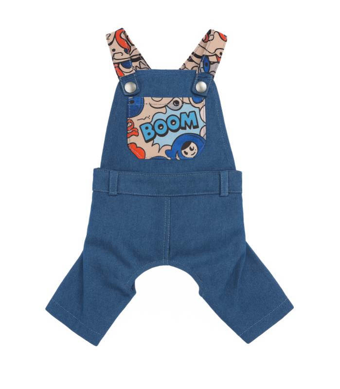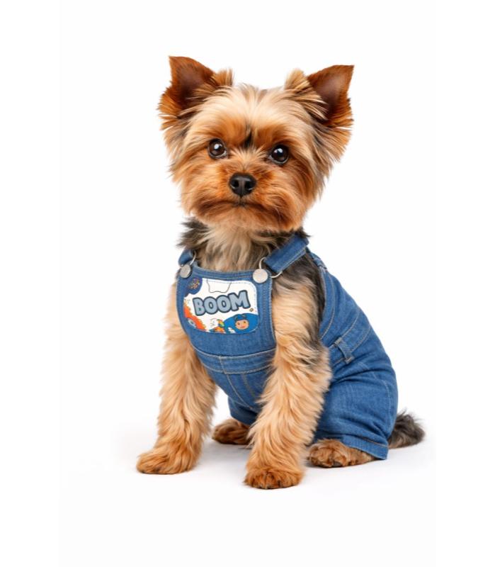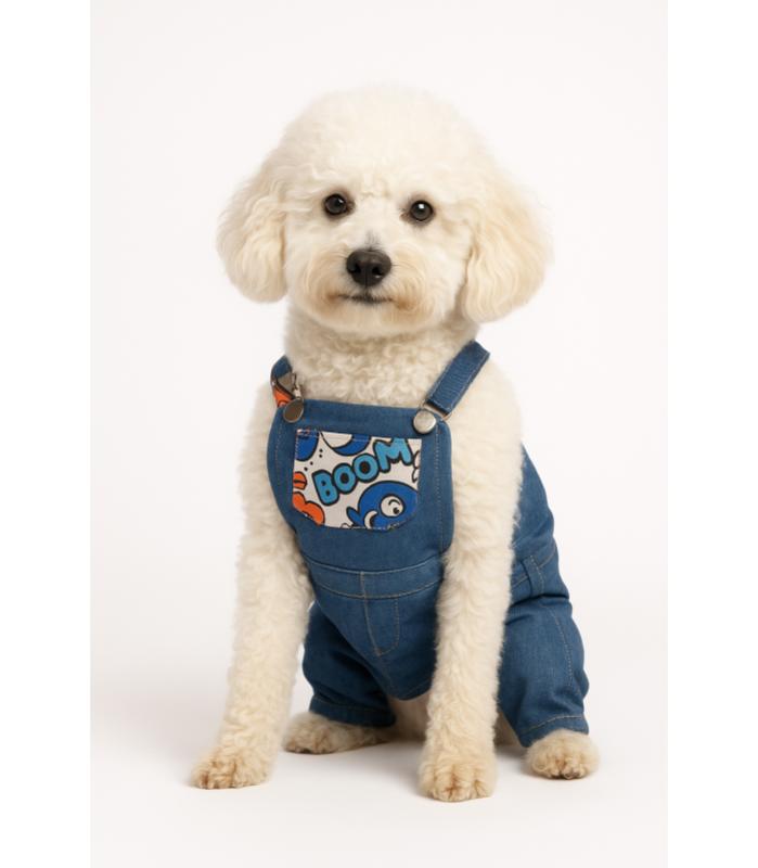 ¡Tu peludo se robará todas las miradas con este adorable overol de mezclilla BOOM! Diseñado especialmente para brindar comodidad y libertad de movimiento, combina un look moderno con un toque divertido gracias a su bolsillo estampado con colores vibrantes y el texto “BOOM”.
