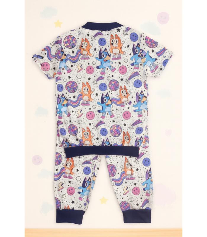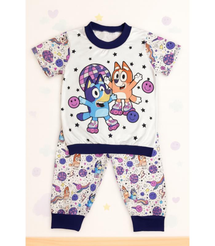 Este Pijama Infantil Bluey Estrellas y Patines con diseño de roller disco es ideal para que los pequeños disfruten de noches llenas de color y alegría. Con una camiseta de manga corta y pantalón largo, ofrece la combinación perfecta para mantenerse fresco y cómodo en cualquier época del año.