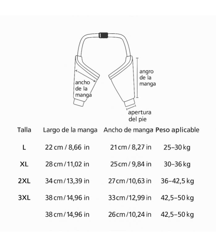 - Se ajusta mediante una correa que pasa por el cuerpo, manteniendo las mangas en su lugar incluso durante la actividad.