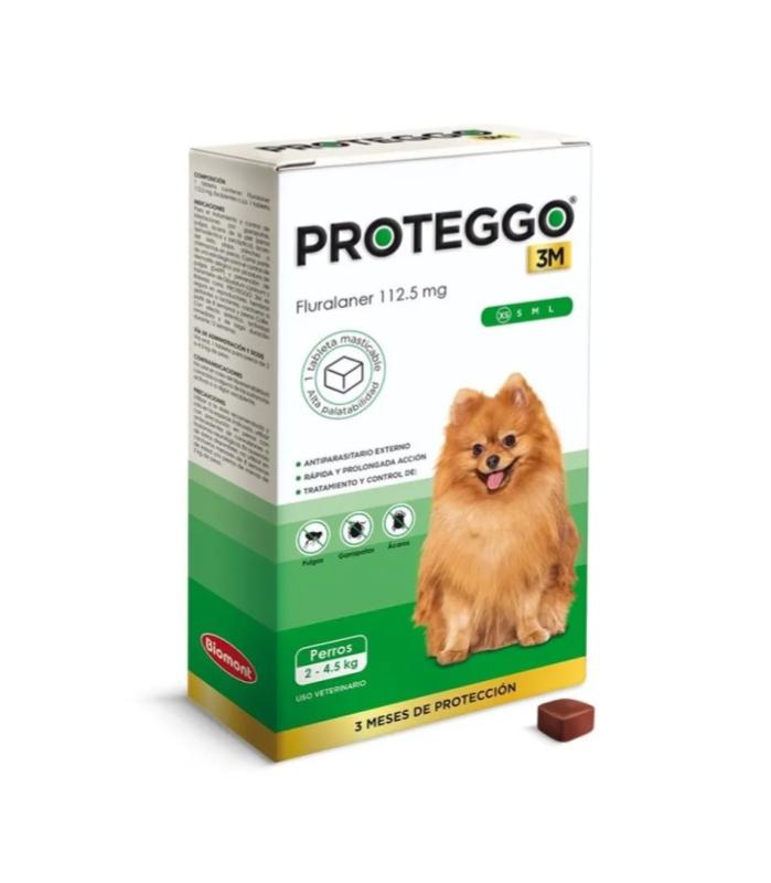 Proteggo Antipulgas 2-4.5kg – 3 meses protección está indicado para el tratamiento y control de las infestaciones producidas por garrapatas, pulgas y ácaros en perros, proporcionando una actividad sistémica inmediata y larga acción.
