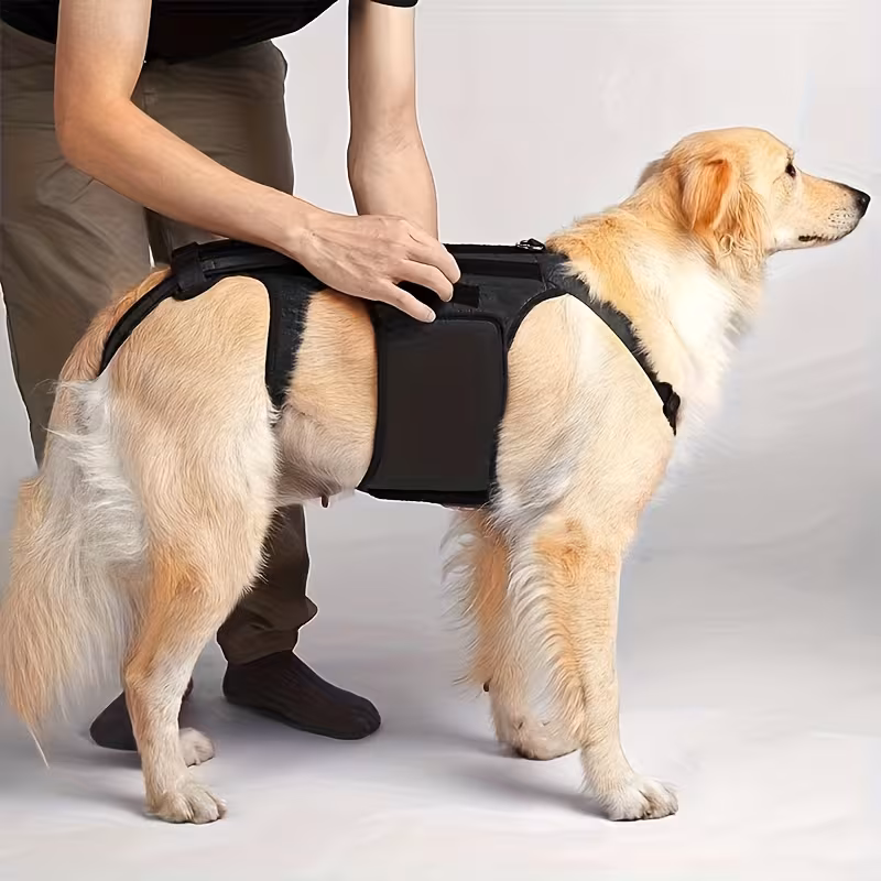 Fabricado con material resistente, flexible y cómodo, se adapta al cuerpo del perro sin limitar su movimiento natural. Su diseño ergonómico proporciona soporte firme mientras permite caminar con mayor seguridad y estabilidad.
