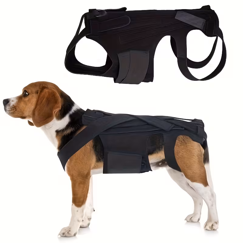 Fabricado con material resistente, flexible y cómodo, se adapta al cuerpo del perro sin limitar su movimiento natural. Su diseño ergonómico proporciona soporte firme mientras permite caminar con mayor seguridad y estabilidad.