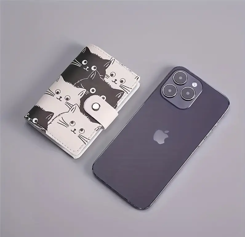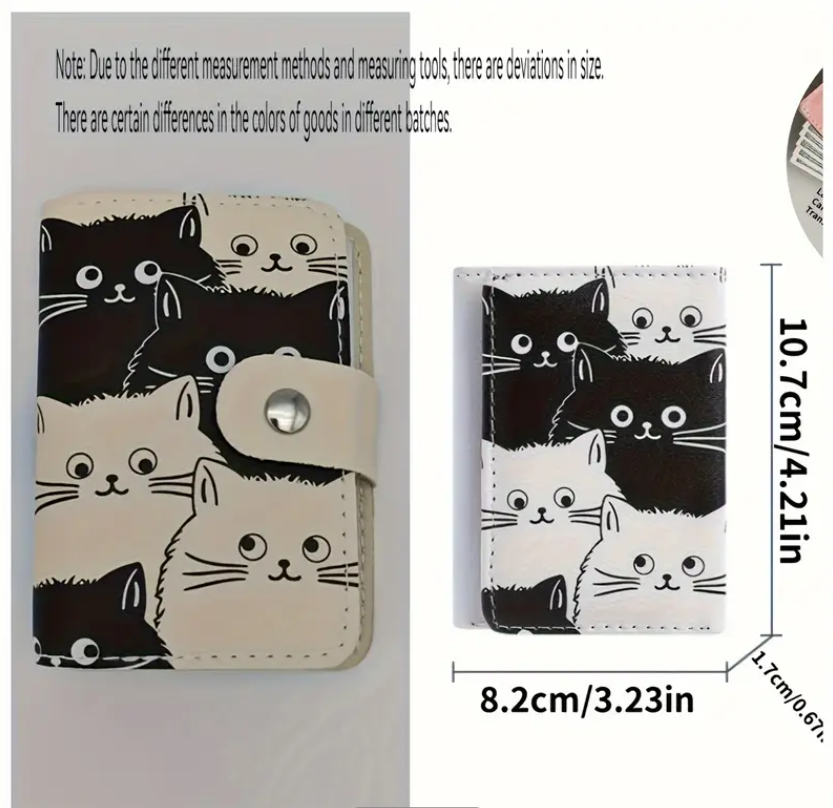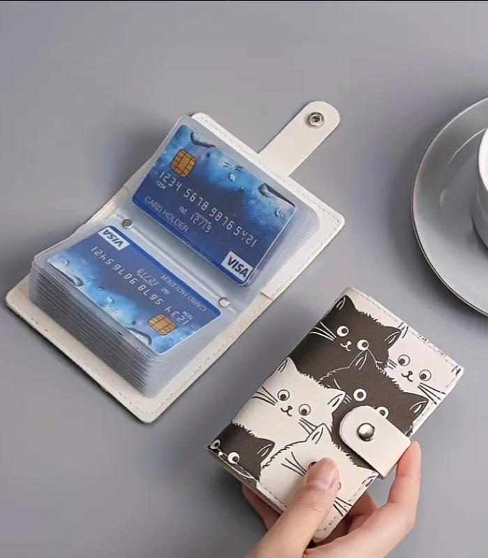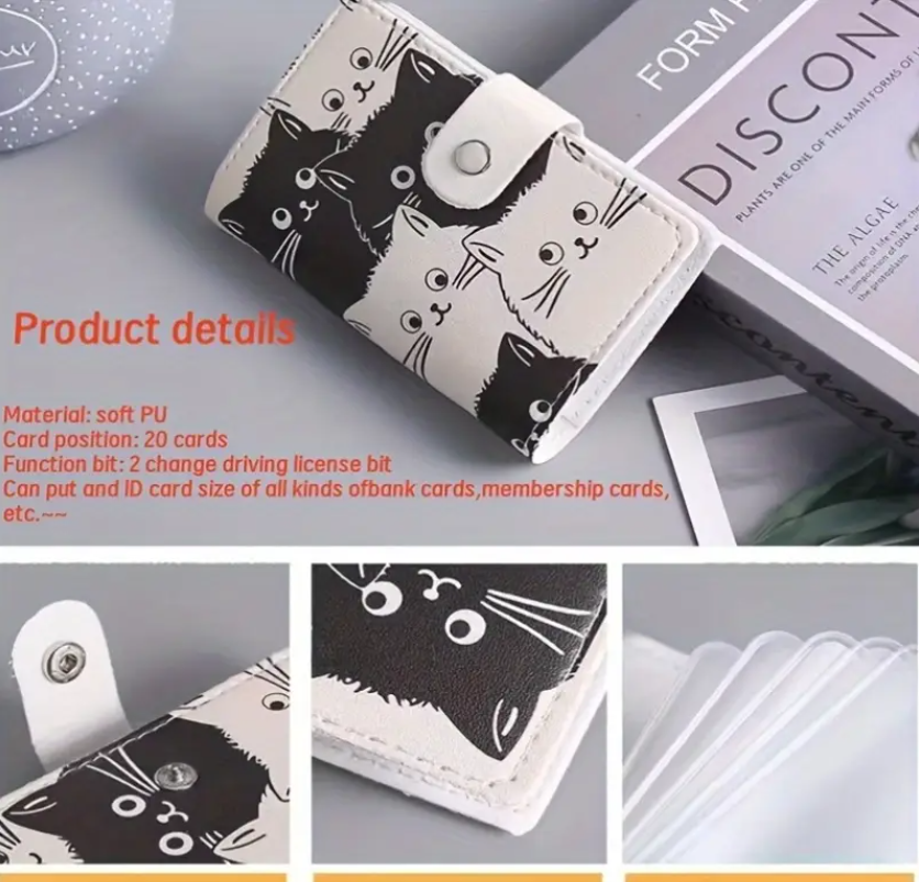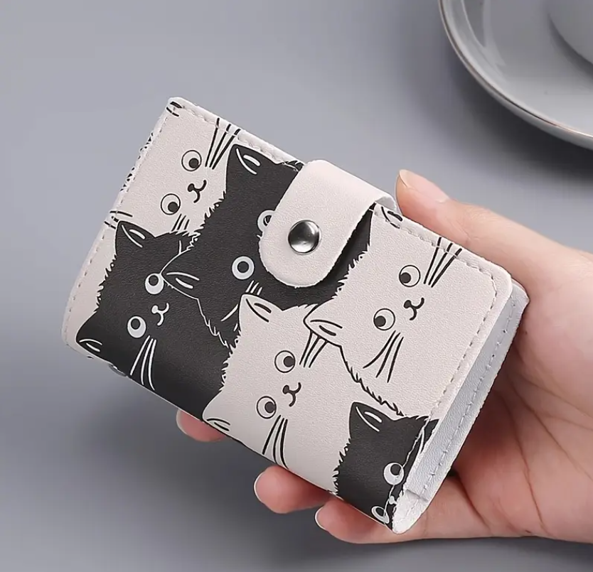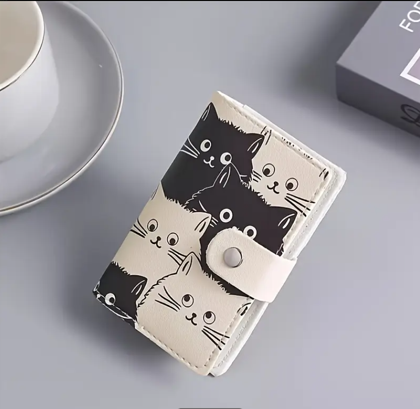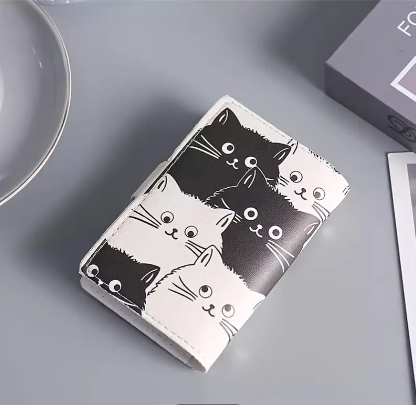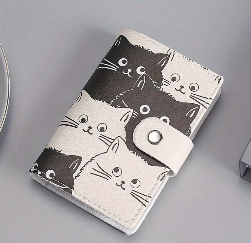 El estampado está inspirado en gatitos en tonos blanco y negro, con expresiones dulces que le dan un toque divertido y original. Gracias a su formato compacto, es perfecto para quienes desean llevar varias tarjetas en un solo lugar sin ocupar demasiado espacio en el bolso o bolsillo.